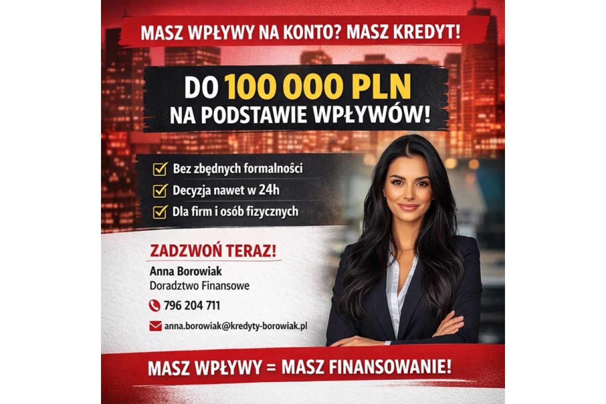 MASZ WPŁYWY NA KONTO? TO MASZ KREDYT. DO 100 000 PLN NA PODSTAWIE OBROTÓW