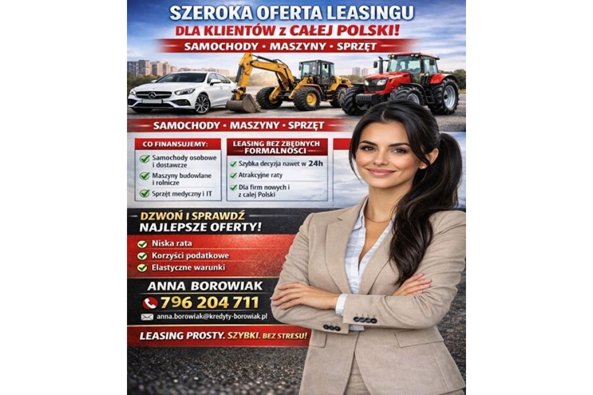 Szukasz finansowania samochodu, maszyn lub sprzętu do firmy? Dobrze trafiłeś! Oferujemy atrakcyjne warunki leasingu dla przedsiębiorców z całej Polski – szybko, bez zbędnych formalności i z indywidualnym podejściem.
