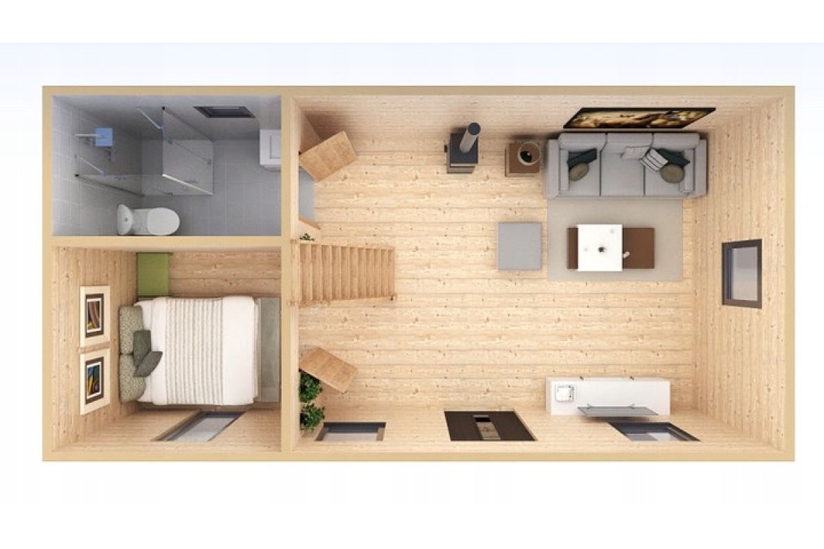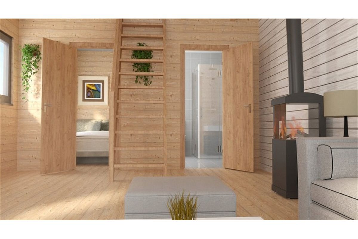 W standardzie domek wyposażony jest w schody stałe prowadzące na antresolę. W ofercie posiadamy również schody rozkładane – wybór zależy od preferencji klienta.